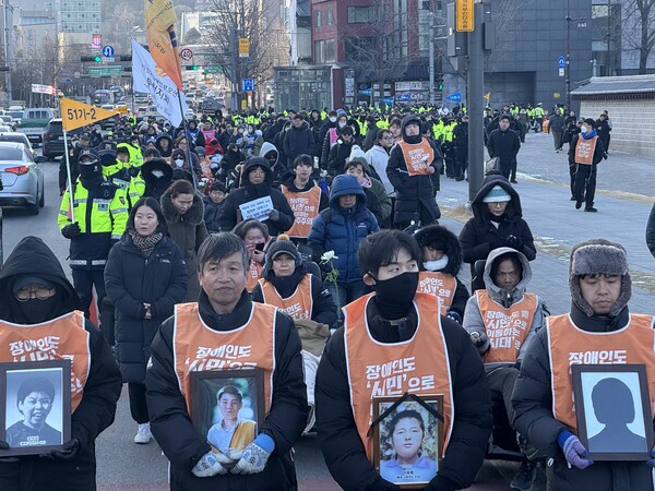 "이재명 정부는 인천판 도가니 색동원 사건 해결하라" 장애인 거주시설 인권참사 해결 촉구 및 시설피해 희생자 합동추모제 이후 서울경찰청 앞까지 행진을 진행했다.ⓒ전국장애인차별철폐연대