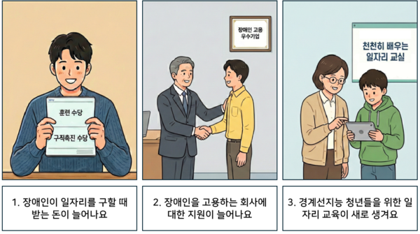 1 장애인이 일자리를 구할 때 받는 돈이 늘어나요. 2 장애인을 고용하는 회사에 대한 지원이 늘어나요. 3 경계선지능 청년들을 위한 일자리 교육이 새로 생겨요. ©AI 편집실